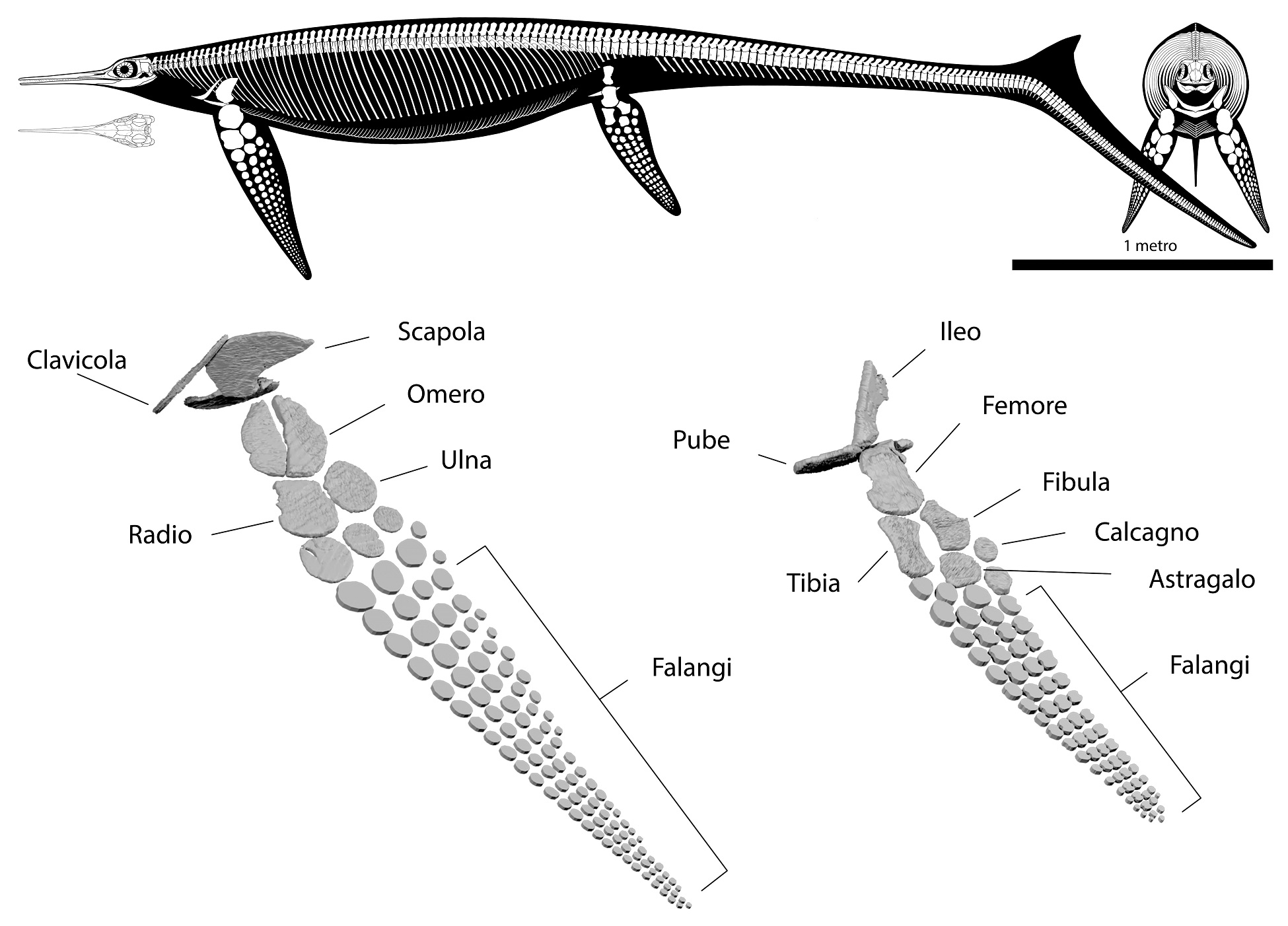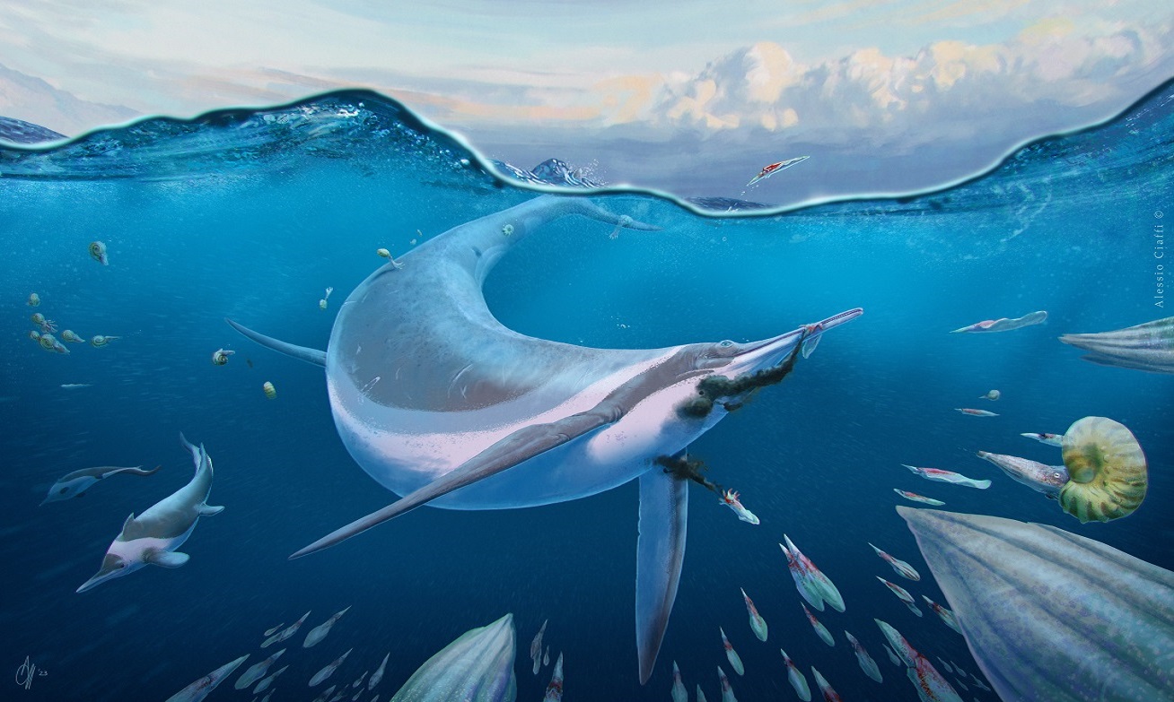 Pur sembrando pesci, gli ittiosauri erano rettili - per nulla imparentati coi dinosauri - che si adattarono perfettamente a vivere in mare aperto, trasformando in pinne le zampe dei loro antenati di terraferma. Nel corso della loro evoluzione, svilupparono forme molto varie e quelle più primitive, presenti anche in Italia, riservano sempre nuove sorprese. “Le pinne anteriori e posteriori sono completamente diverse: se non fossero attaccate allo stesso corpo nessuno crederebbe che appartengono a una sola specie” afferma Cristiano Dal Sasso, paleontologo del Museo di Storia Naturale di Milano, che nel 1996 diede il nome Besanosaurus leptorhynchus al più antico e famoso ittiosauro italiano.