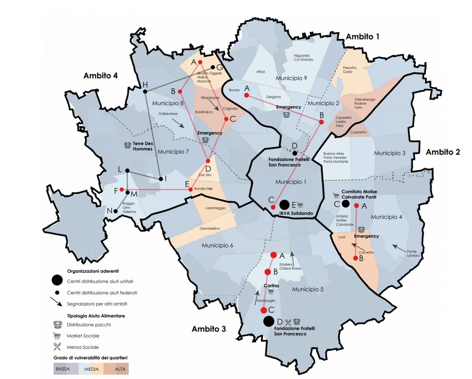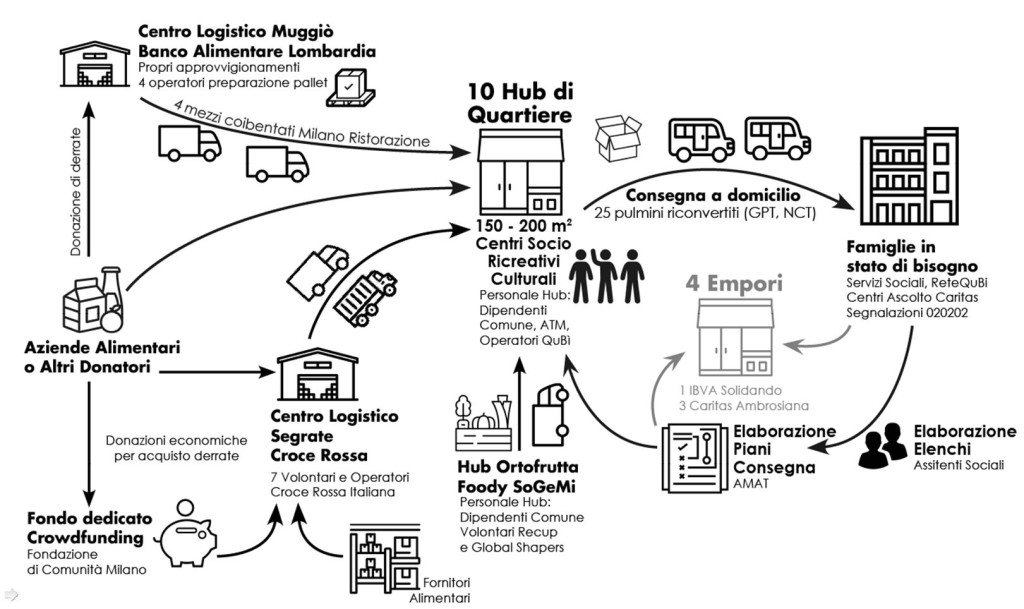Il servizio prevedeva che le derrate alimentari disponibili presso i centri logistici del Banco Alimentare della Lombardia a Muggiò, della Croce Rossa Italiana – Comitato di Milano a Segrate, e dall’Hub Ortofrutta presso SoGeMi, venissero redistribuite negli hub temporanei, presso i quali dipendenti del Comune e volontari delle associazioni si occupavano di organizzare e preparare gli aiuti alimentari per le persone e le famiglie beneficiarie.