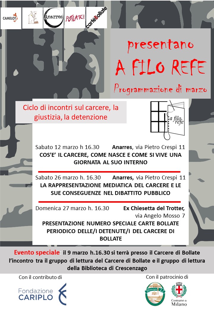 Il prossimo avrà il titolo "Conoscere il carcere: Cos'è il carcere, come nasce e come si vive una giornata al suo interno", e si svolgerà presso Anarres Libreria-Bistrot di via Pietro Crespi 11, sabato 12 marzo 2022 ore 16:30: