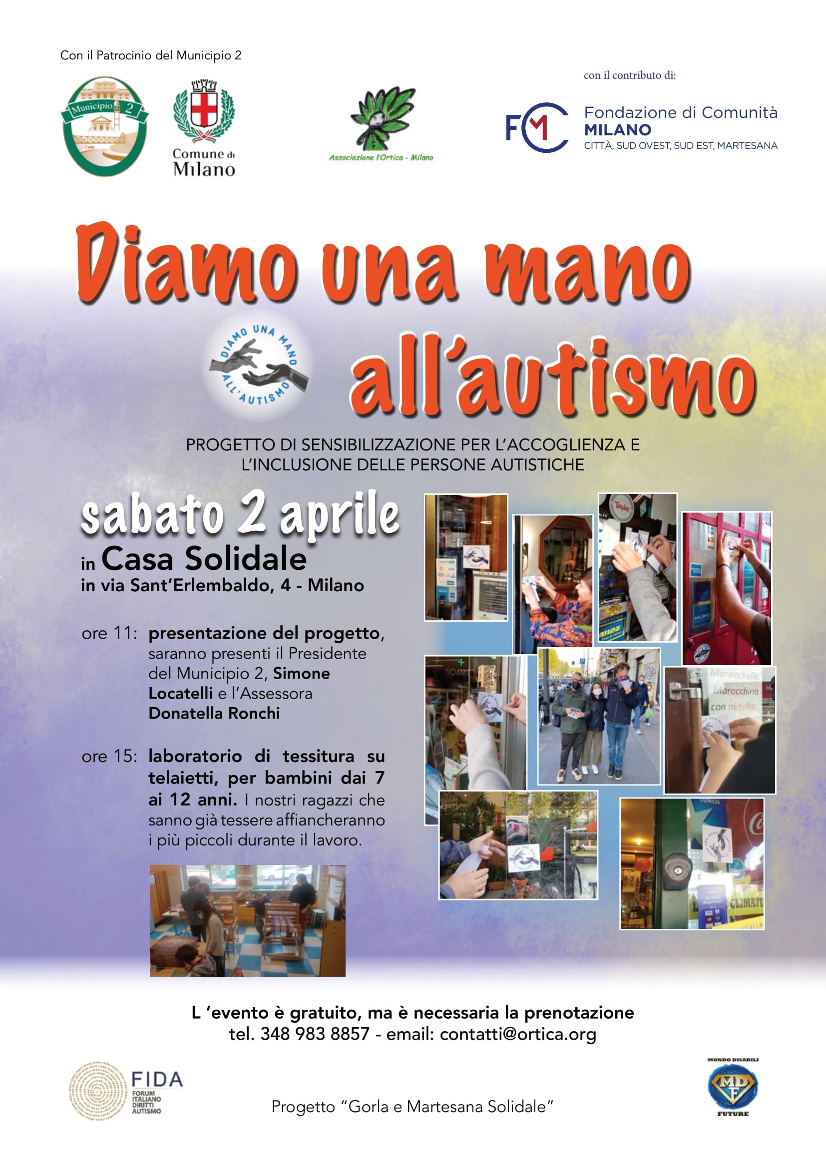 Il programma di sabato 2 aprile 2022 dalle ore 9:00 alle ore 19:00, presso la sede dell’Associazione – Casa Solidale, via Sant’Erlembaldo 4, nel parco Villa Finzi - prevede l'inaugurazione della mostra d'arte "Autalenti", con esposizione di opere di persone autistiche e, nel pomeriggio, offerta di corsi di tessitura su piccoli telai ai bambini del parco con il coinvolgimento di ragazzi autistici che sanno tessere.
