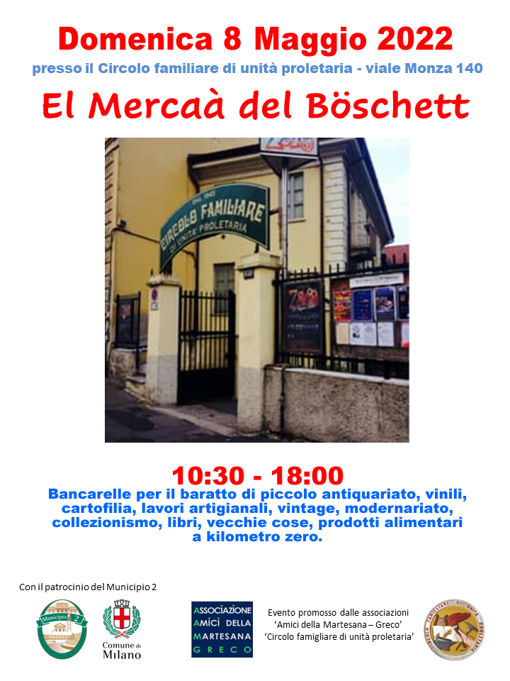Milano 03 maggio 2022 - L'associazione Amici della Martesana-Greco ed il Circolo Familiare di Unità Proletaria organizzano una giornata di festa per domenica 8 maggio 2022 in viale Monza/via Bertelli dalle ore 09:00 alle 20:00, per promuovere e tutelare il Naviglio piccolo e il suo contesto, una delle opere più importanti dell'ingegneria rinascimentale.