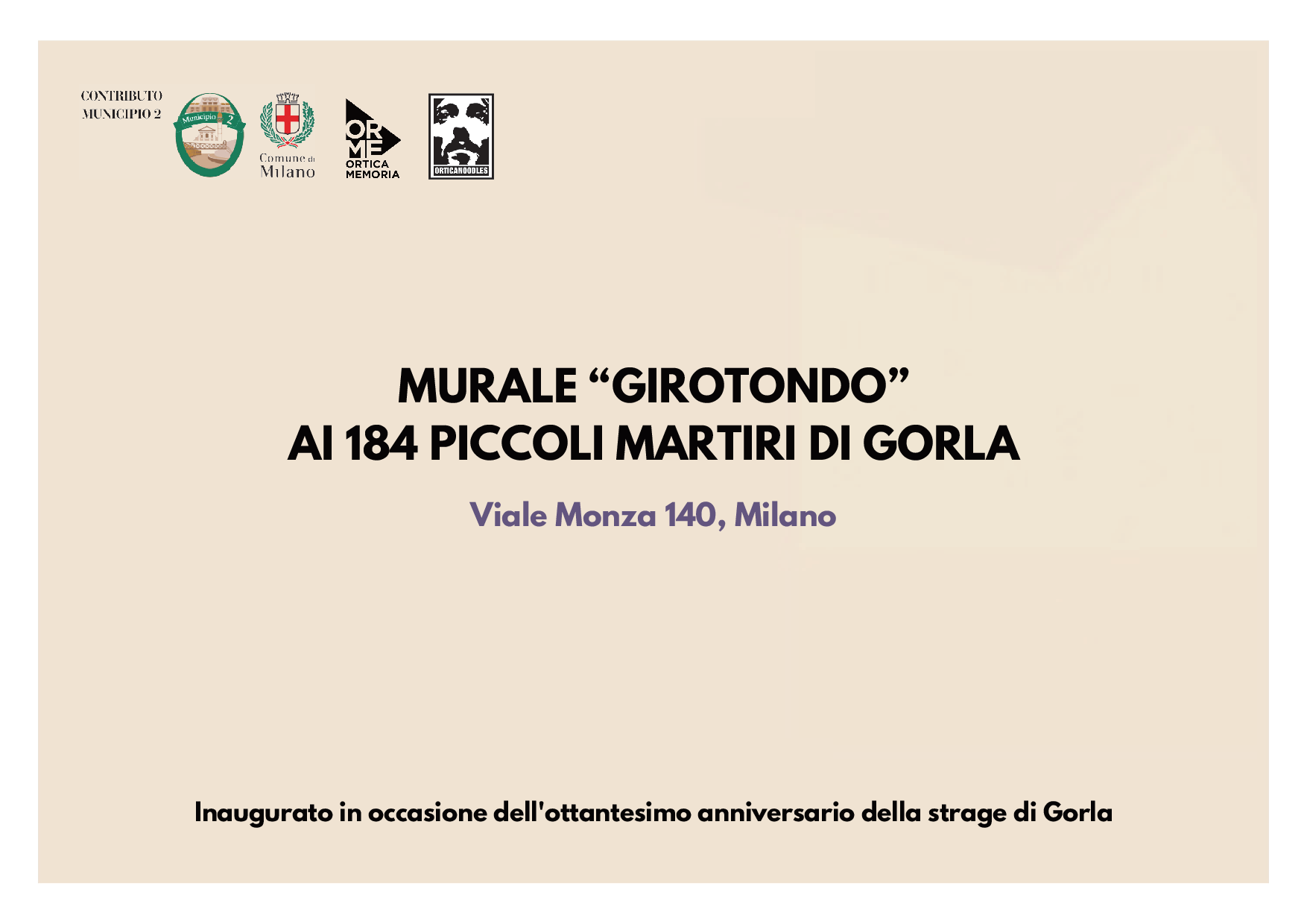 Sabato 19 ottobre 2024 alle 16:00 in viale Monza 140, nell'ambito della settimana di eventi per le celebrazioni commemorative dell'80° anniversario del bombardamento della scuola di Gorla, verrà inaugurato un grande murale dedicato ai Piccoli Martiri dal titolo "Girotondo. Ai Piccoli Martiri di Gorla" realizzato da OrMe Ortica Memoria e Orticanoodles.