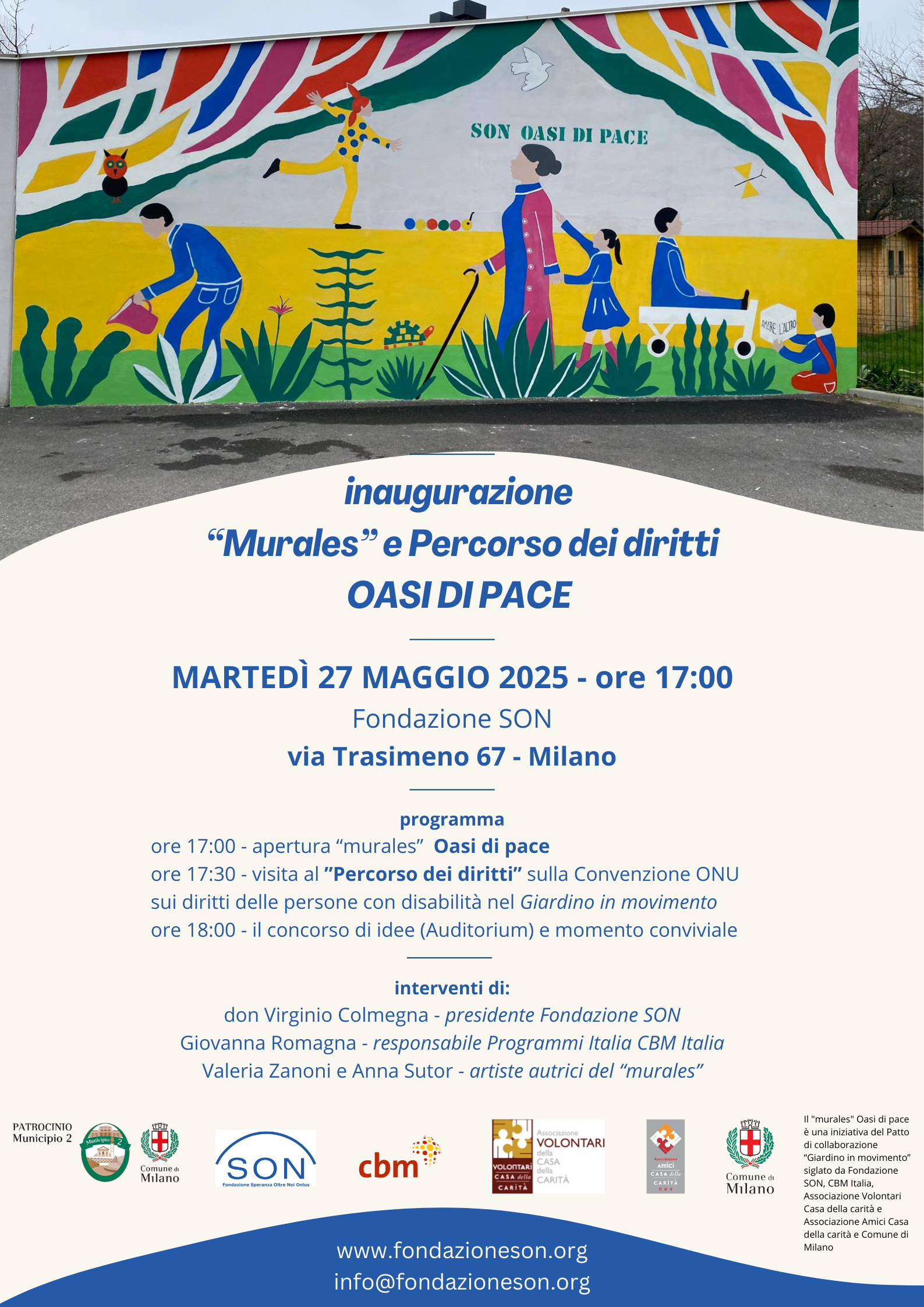 L’opera nasce da un concorso di idee lanciato lo scorso anno da Fondazione SON, in collaborazione con CBM Italia, Associazione Volontari Casa della carità e Associazione Amici Casa della carità, all’interno del Patto di collaborazione che anima il “Giardino in movimento” attiguo a SON, con l'obiettivo di trasformare una porzione di muro in una narrazione visiva collettiva, capace di rappresentare il concetto di “Oasi di pace”.