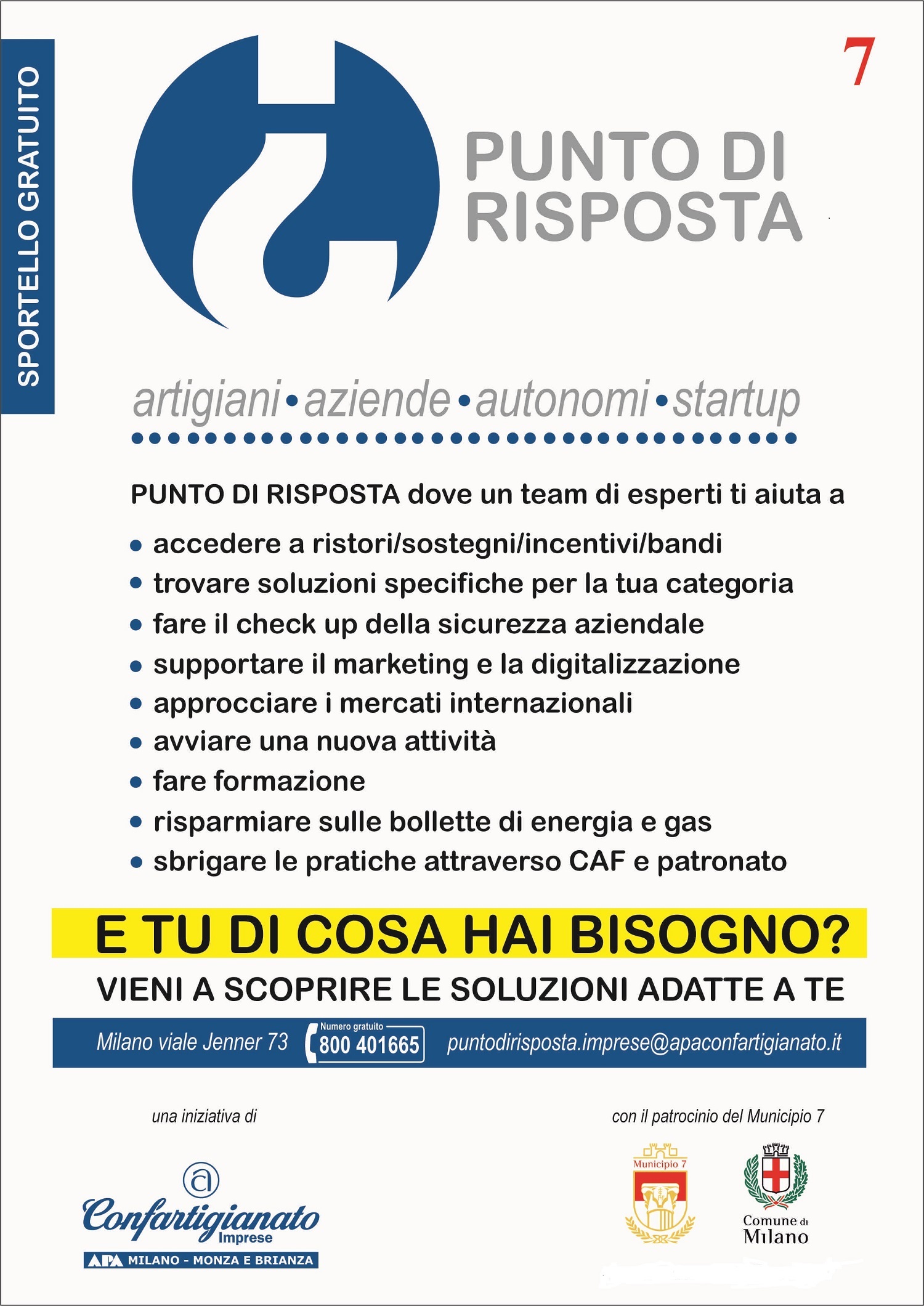 Milano, 23 marzo 2022 L’Associazione APA Confartigianato Imprese Milano, Monza e Brianza con il patrocinio del Municipio 7 realizza lo sportello “Punto di risposta Artigiani, Aziende, Autonomi, Start up” che offre un servizio di ascolto e di assistenza gratuiti tramite recapito telefonico ed indirizzo mail dedicato.